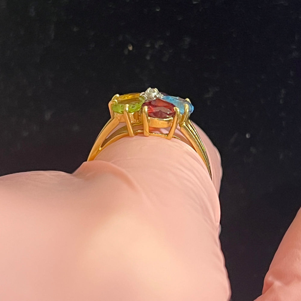 14k yellow gold, natural garnet, peridot, citrine, amethyst, and blue topaz, size 6, resizable for free, 3g