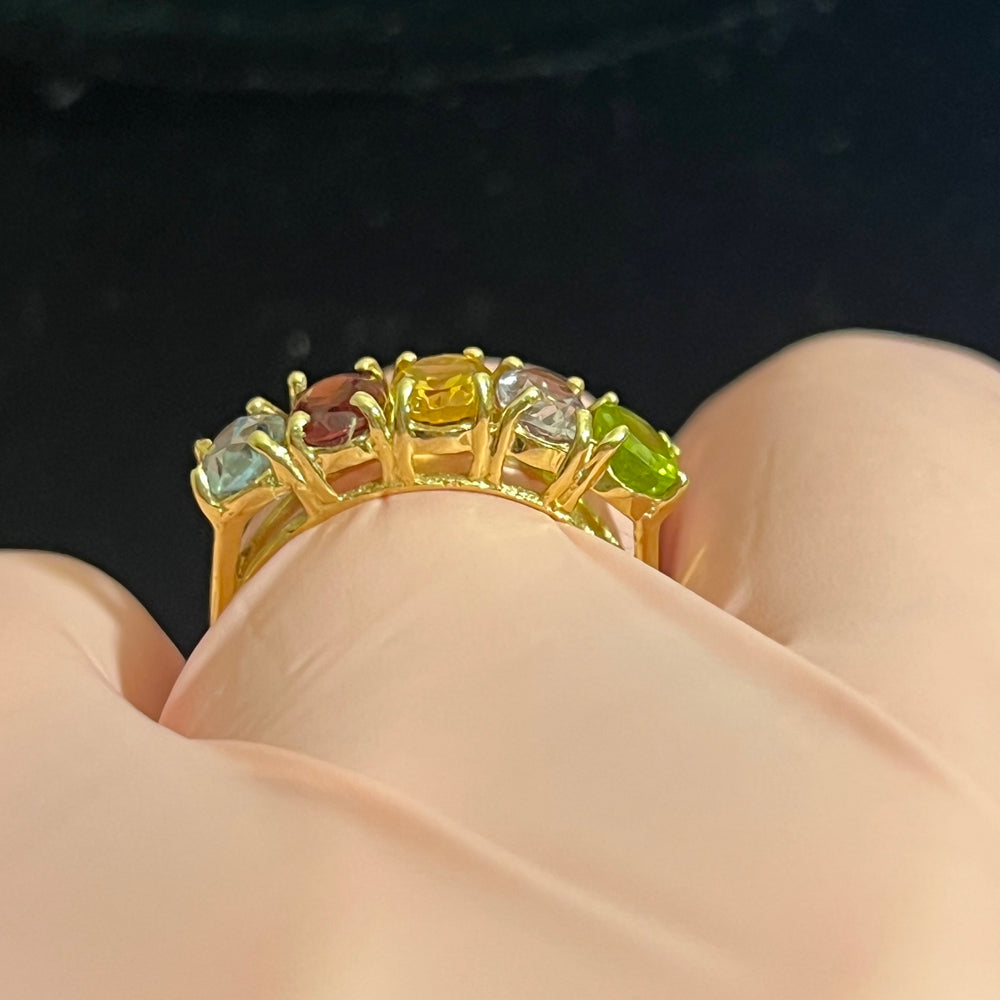 14k yellow gold, natural peridot, amethyst, citrine, garnet and blue topaz, size 5 1/2. resizable for free, 2.1g