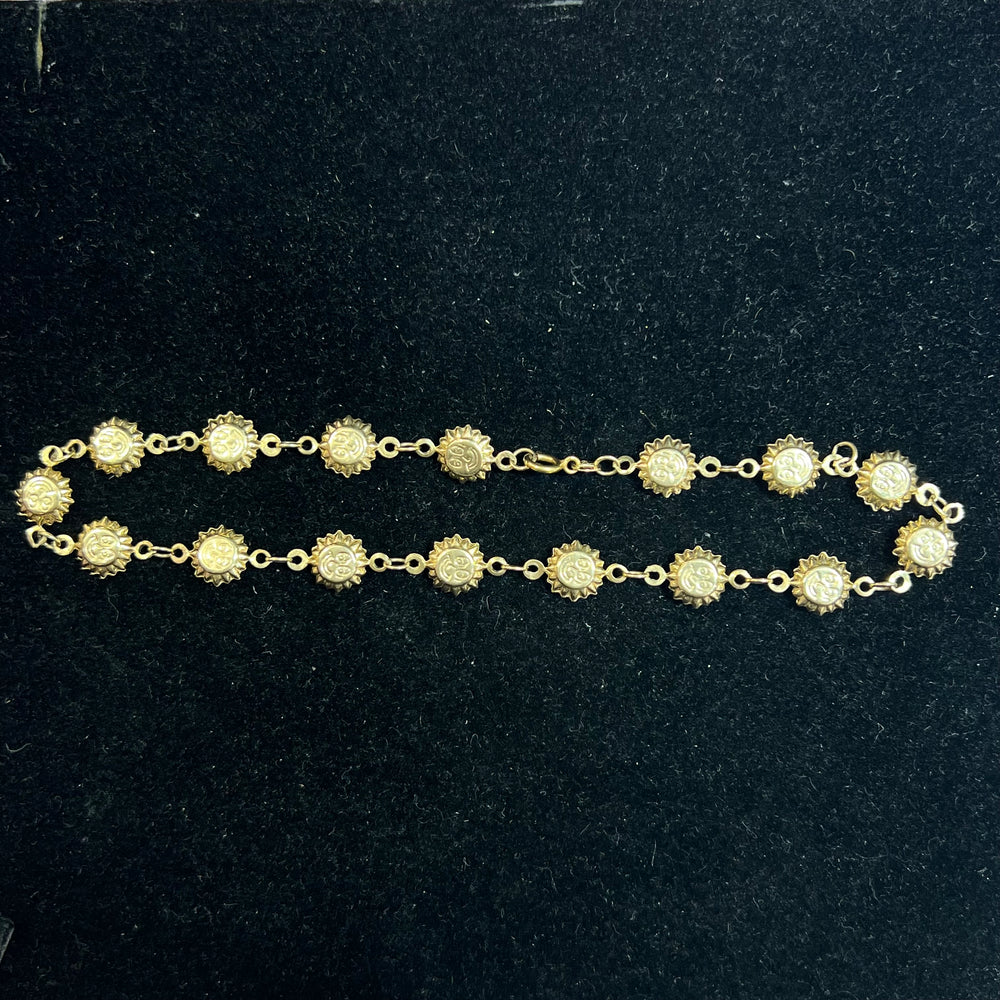 This anklet is so fun and funky? Fun(ky)? I need to sleep! This is a 14k yellow gold puffed Sun Anklet, it’s stronger than it looks (not weak like other puffed jewelry) and can be resized down if you’d like it as a bracelet. (Size: 10 inches, resize down only by request, price will be reduced accordingly)