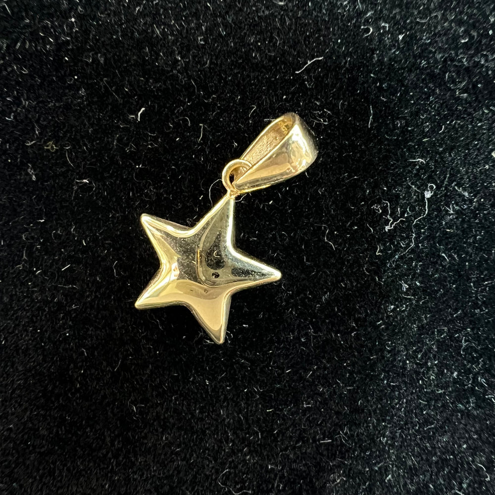 This 14k yellow gold star charm is so cute! Such a beautiful design, and well-crafted. This is a puffed (hollow) charm but is a good standard strength. Not easily dentable at all. (Size: .40 inch wide, .75 inch long with bail)