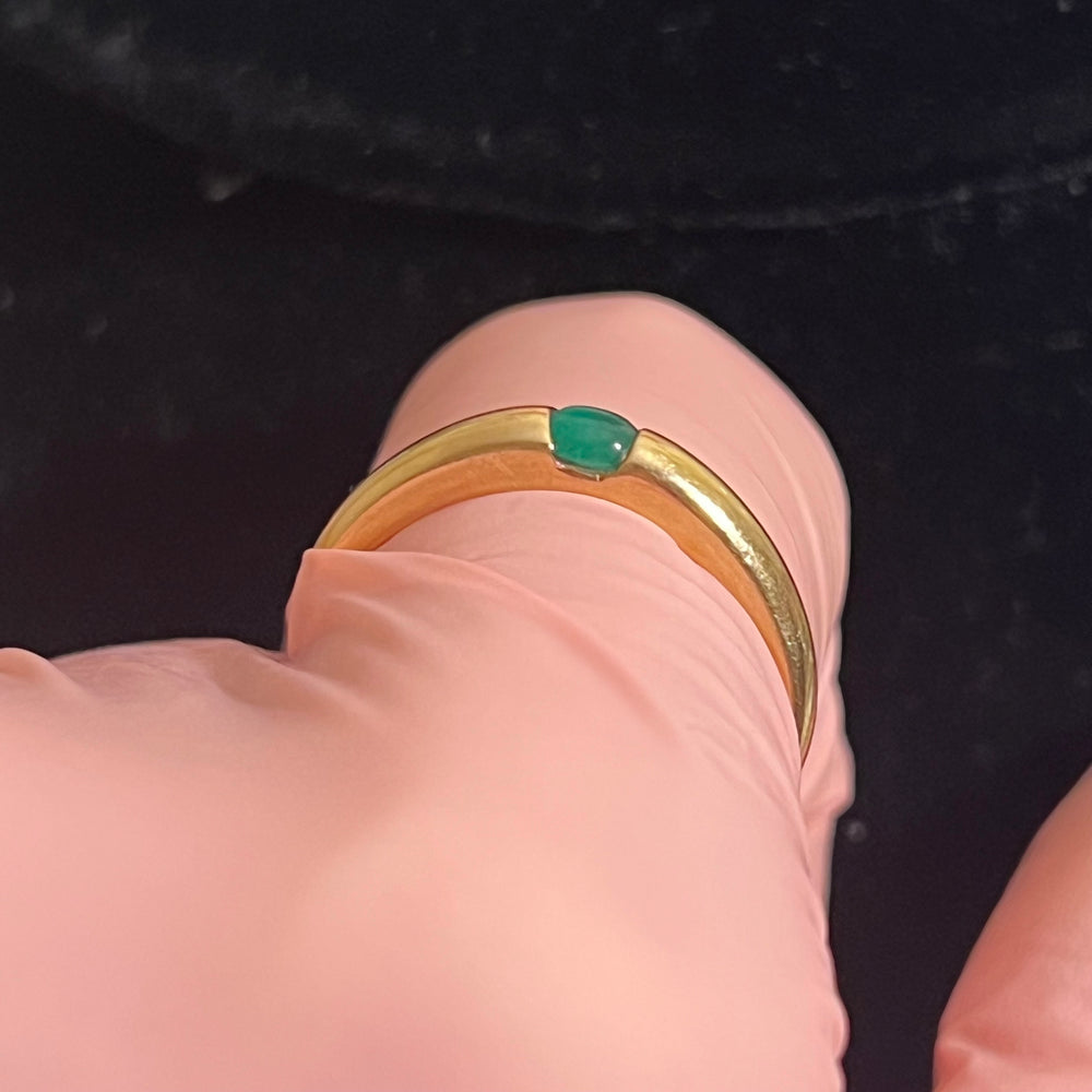 14k yellow gold (slightly rose colored), natural emerald cabochon, size 6 1/2, resizable for free, 2.3g