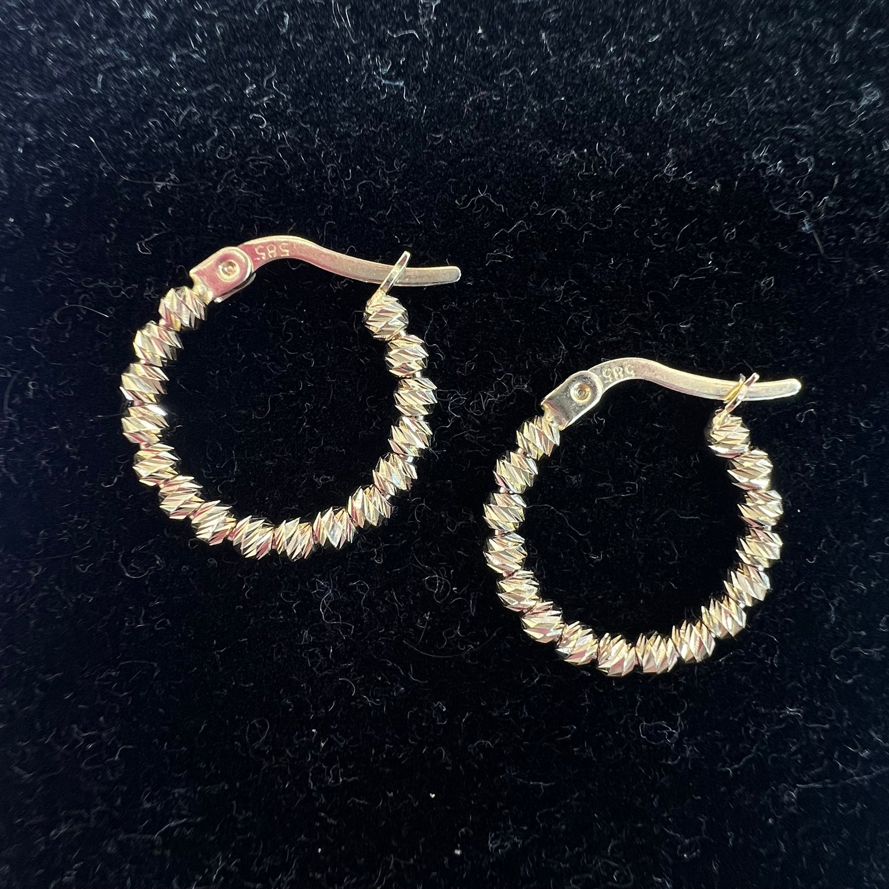 14k yellow gold small diamond cut beaded hoops (Measures 17.5mm wide, 18.3mm long, 2.5mm thick)