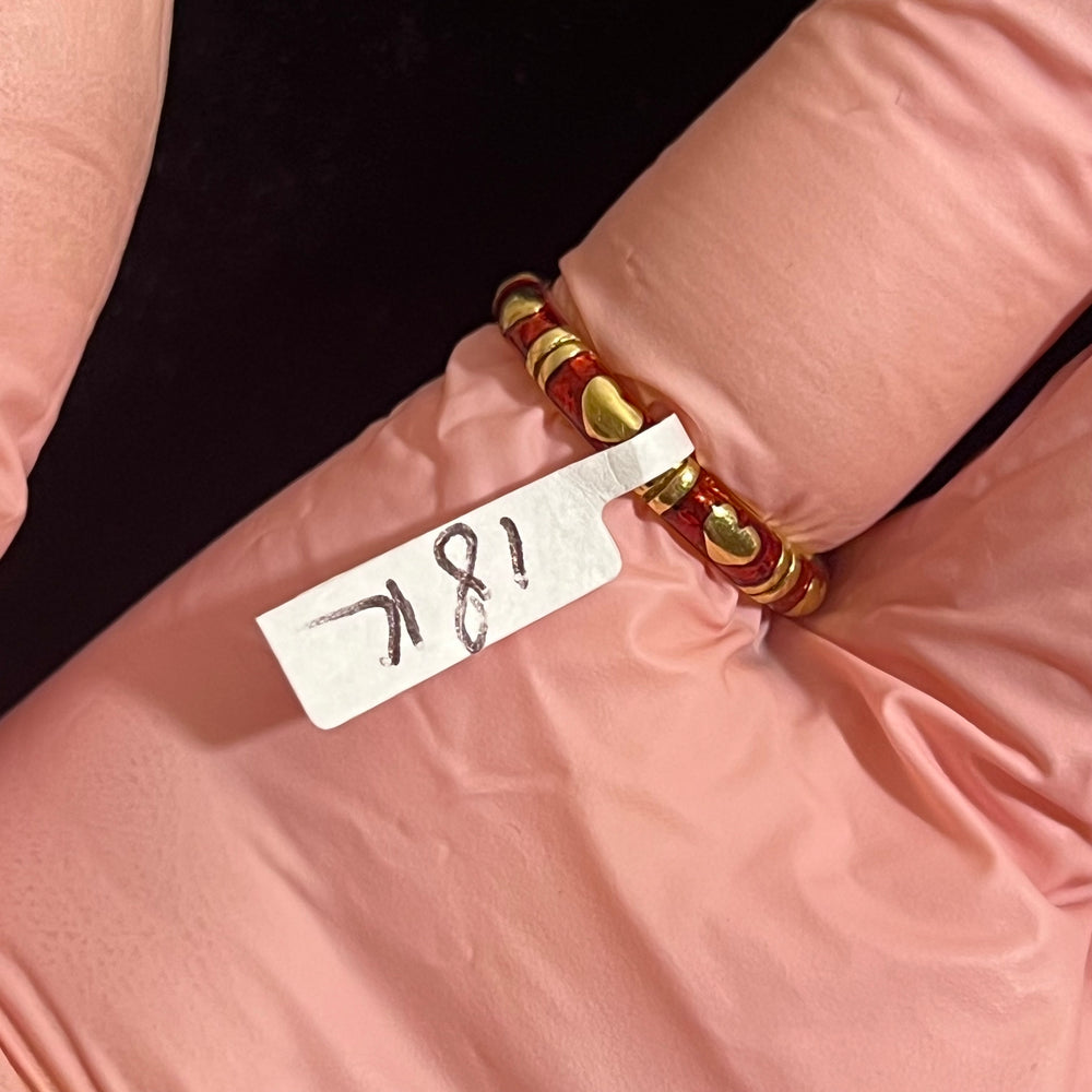 18k yellow gold, red enamel, size 6 1/4, unable to be resized, 4.2g
