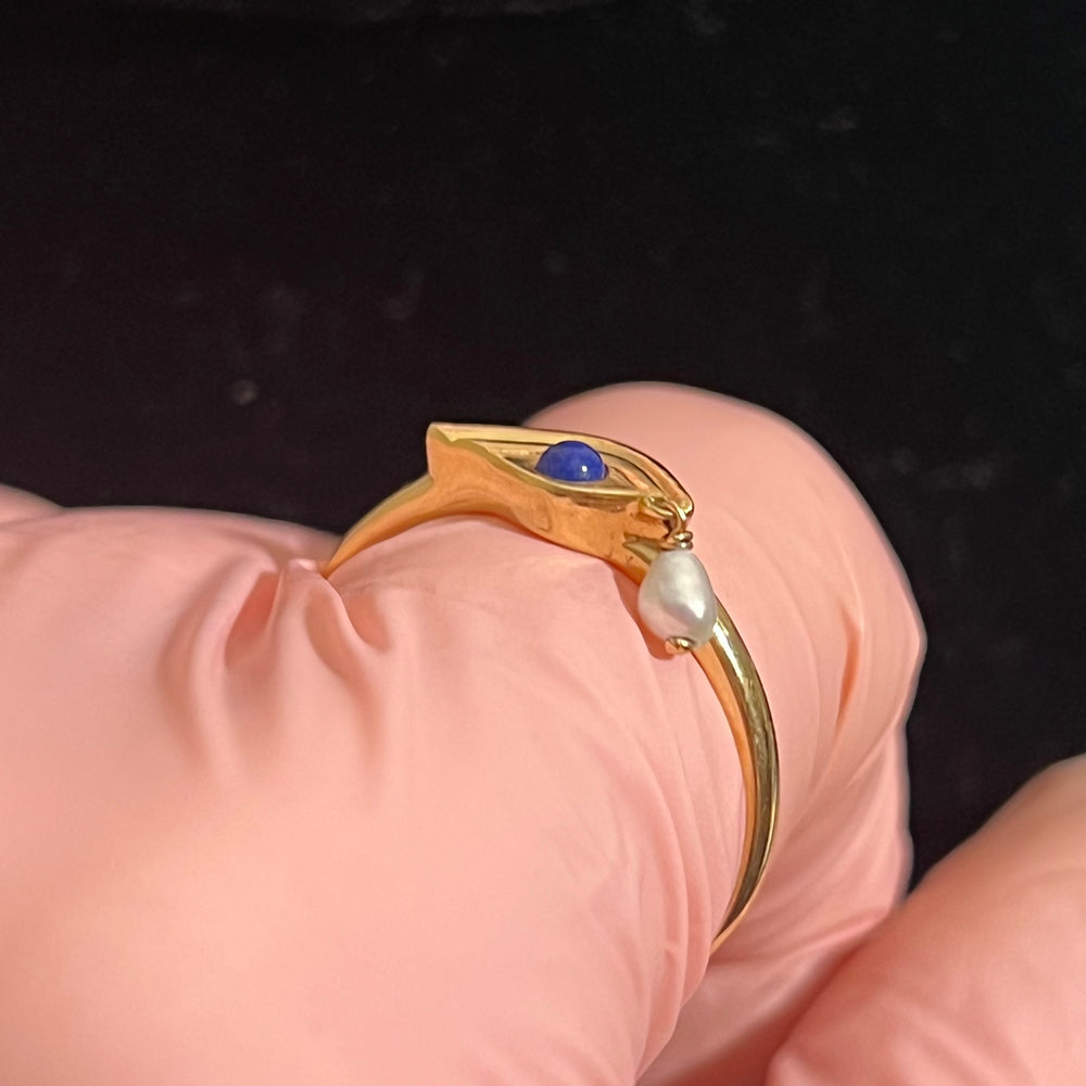 14k yellow gold, natural sapphire cabochon and pearl, size 8, resizable for free, 2.7g