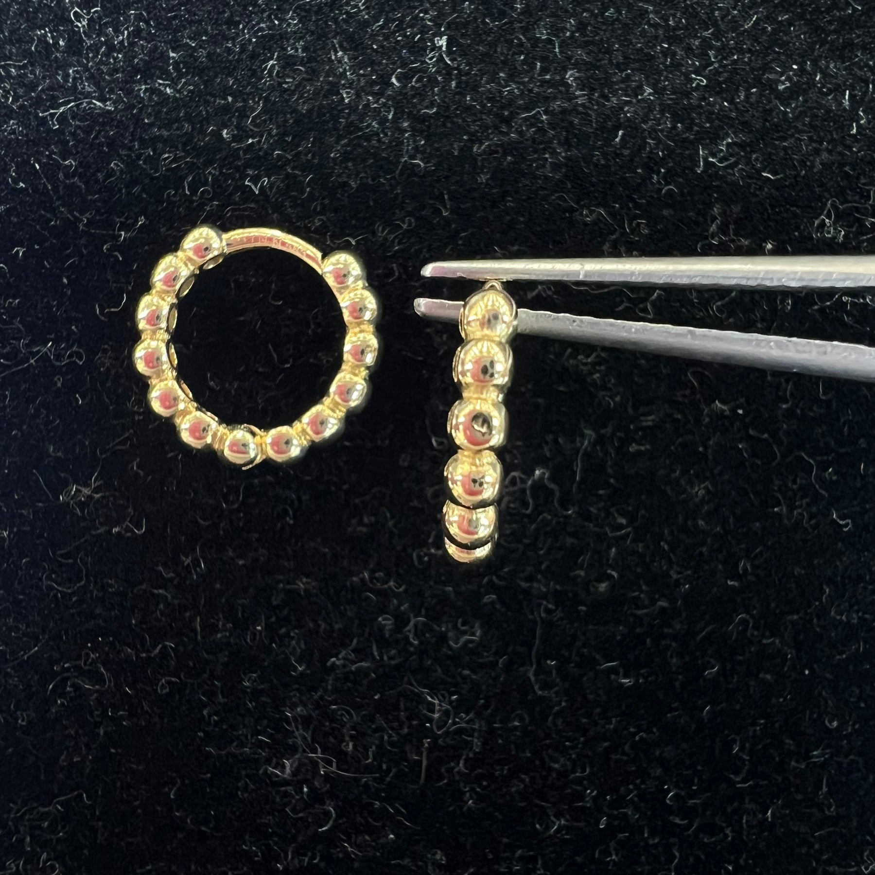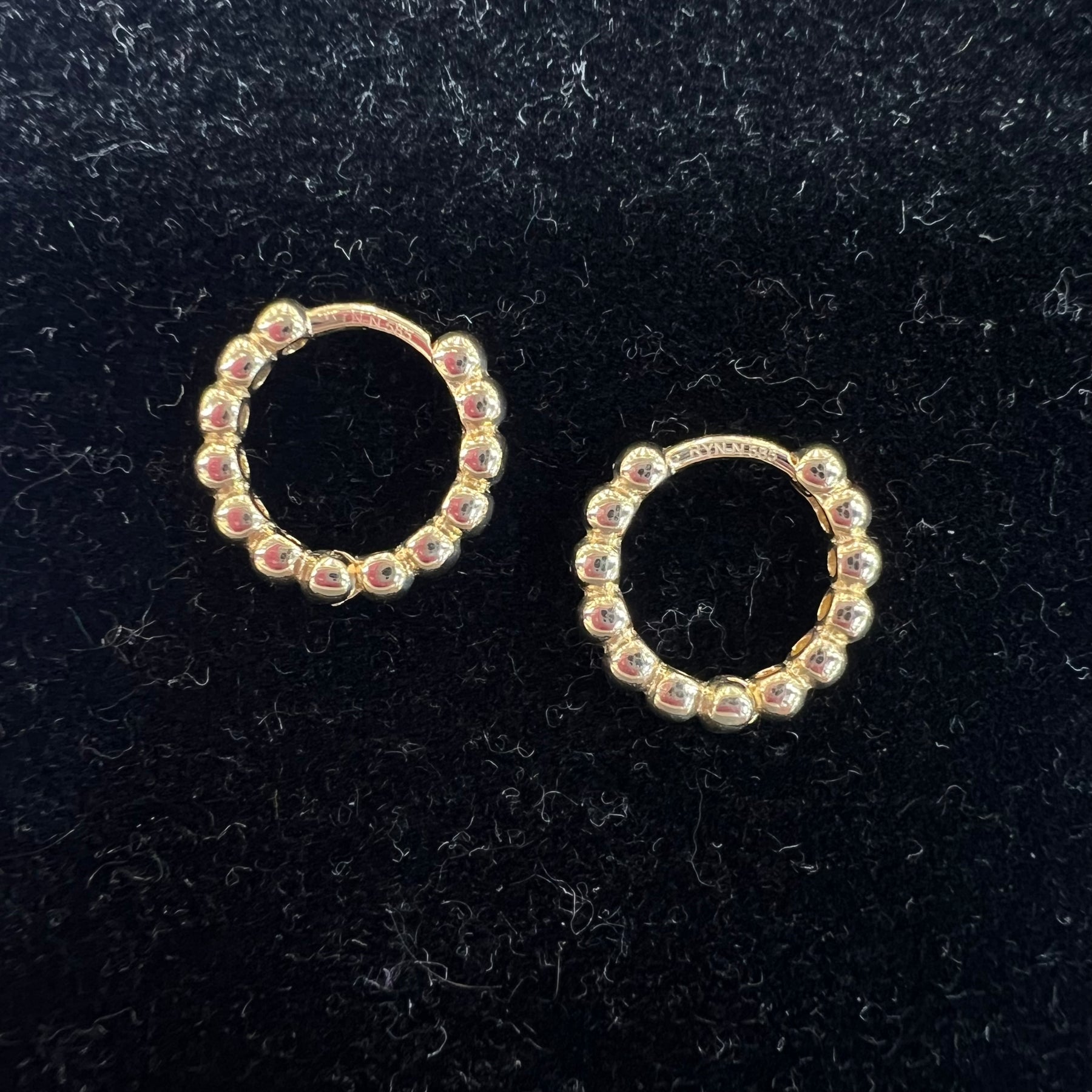 14k yellow gold mini ball huggies (Measures 12.1mm wide, 11.7mm long, 2.1mm thick)